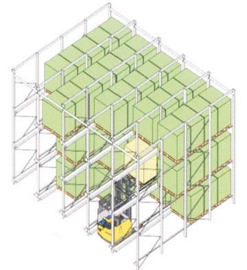 - 駛?cè)胧截浖軉蜗蜇浖芸偵疃日2怀^7個(gè)托盤深度,但設(shè)計(jì)時(shí)貴公司為了提高存儲(chǔ)容量,加長到10個(gè)托盤深度,所以叉車駛?cè)胴浖芡ɡ葍?nèi)叉取貨物或叉取提升貨物后退出貨架通廊時(shí),一定要對(duì)正通道,緩慢行駛,保持直行,避免叉車撞到貨架。