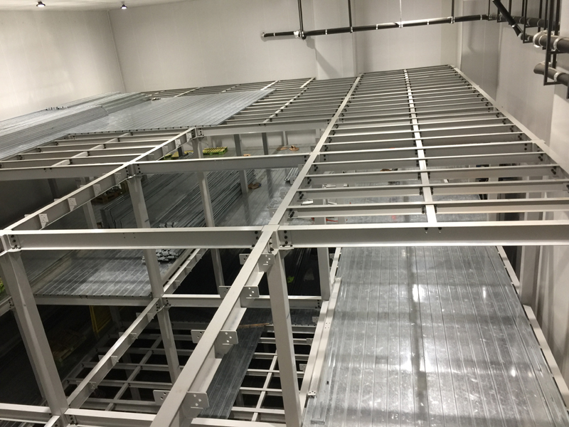 主要由立柱、主梁、次梁、樓面板、樓梯及護(hù)欄組成,樓面下方也可根據(jù)需要配置照明系統(tǒng)。貨物輸送可選擇液壓升降平臺(tái)、貨梯或叉車(chē)。