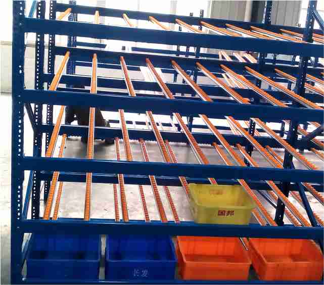 滾輪式料架簡稱流利架,是將貨物置于滾輪上,利用一邊通道存貨,另一邊通道取貨。料架朝出貨方向向下傾斜,貨物在重力作用下向下滑動?蓪崿F(xiàn)先進先出,并可實現(xiàn)一次補貨,多次揀貨。流利架存儲效率高,適合大量貨物的短期存放。